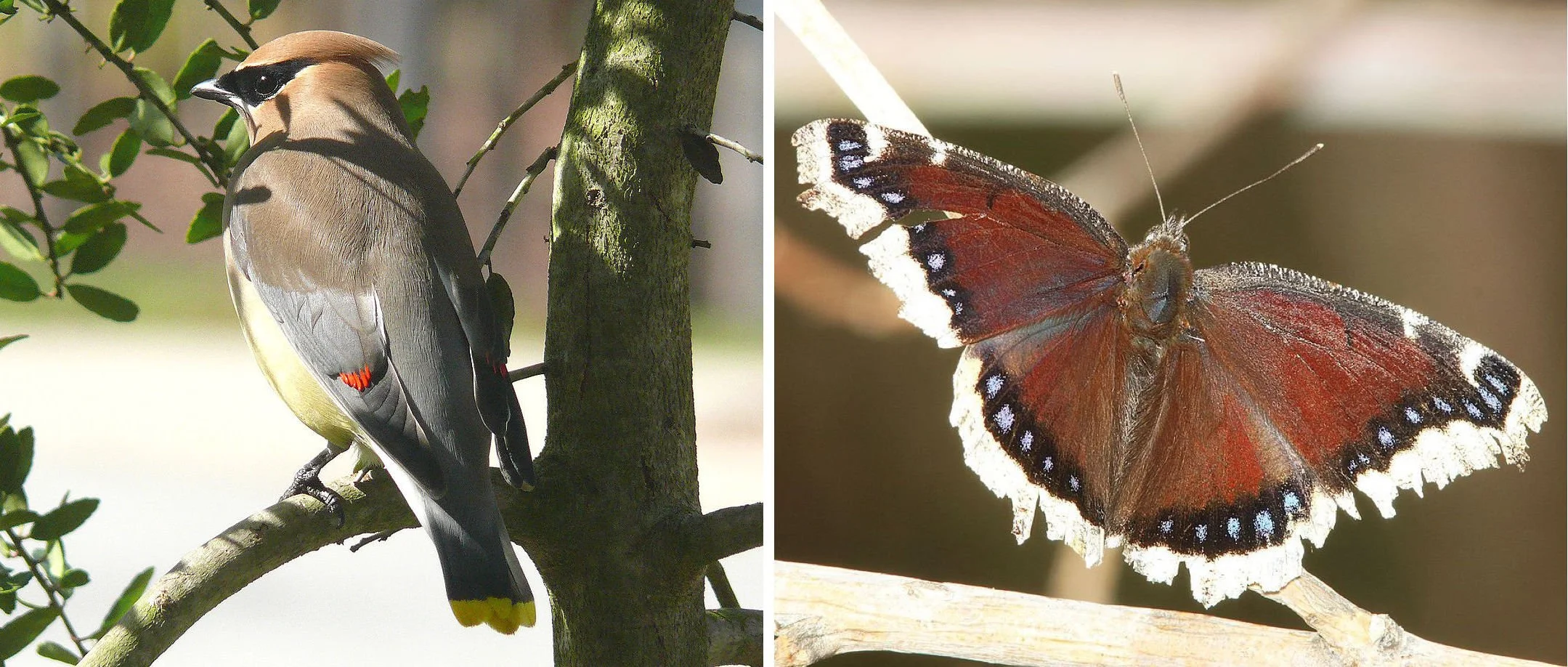 American Holly and Eastern Red-Cedar trees provide winter food for birds like the Cedar Waxwing (left) while the Mourning Cloak butterfly sometimes dines on tree sap.